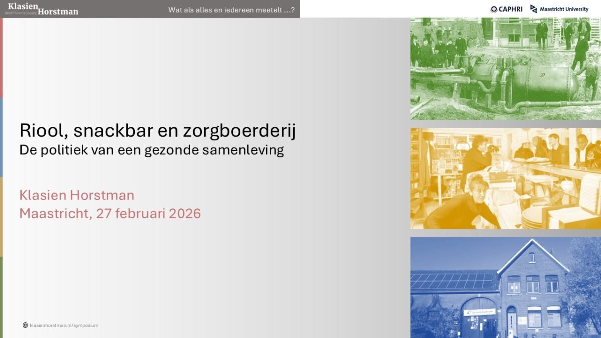 Vijftien jaar geleden pleitte in mijn oratie Dikke kinderen, uitgebluste werknemers en vreemde virussen voor afscheid van een expert-gedreven, individualistische benadering van gezondheid, om ruimte te organiseren voor controverses en engagement om zo de publieke gezondheidszorg levend en ‘publiek’ te maken. Om burgers eigenaar te maken in plaats van object. En, ers is wel iets veranderd. De ‘omgeving’ staat weer op de agenda. Maar de focus op individueel gedrag is diep verankerd in de wetenschappelijke infrastructuur van vragenlijsten, databanken en opleidingen, dus we zijn er nog niet zomaar van af.