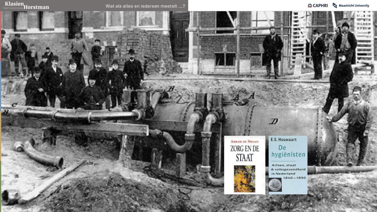Het rioleringsstelsel zoals dat in de 19e en 20e eeuw is aangelegd, is een van de belangrijkste preventieve voorzieningen die we kennen. Het beschermde arm en rijk tegen de cholera en andere epidemieën en was een grote gelijkmaker: gezondheidswinst voor iedereen. Dat was te danken aan het collectieve karakter van dit ondergrondse buizenstelsel. Een riolering heb je namelijk niet alleen. Het wordt dan ook collectief gefinancierd en mensen worden niet individueel afgerekend op wat zij uitscheiden.
