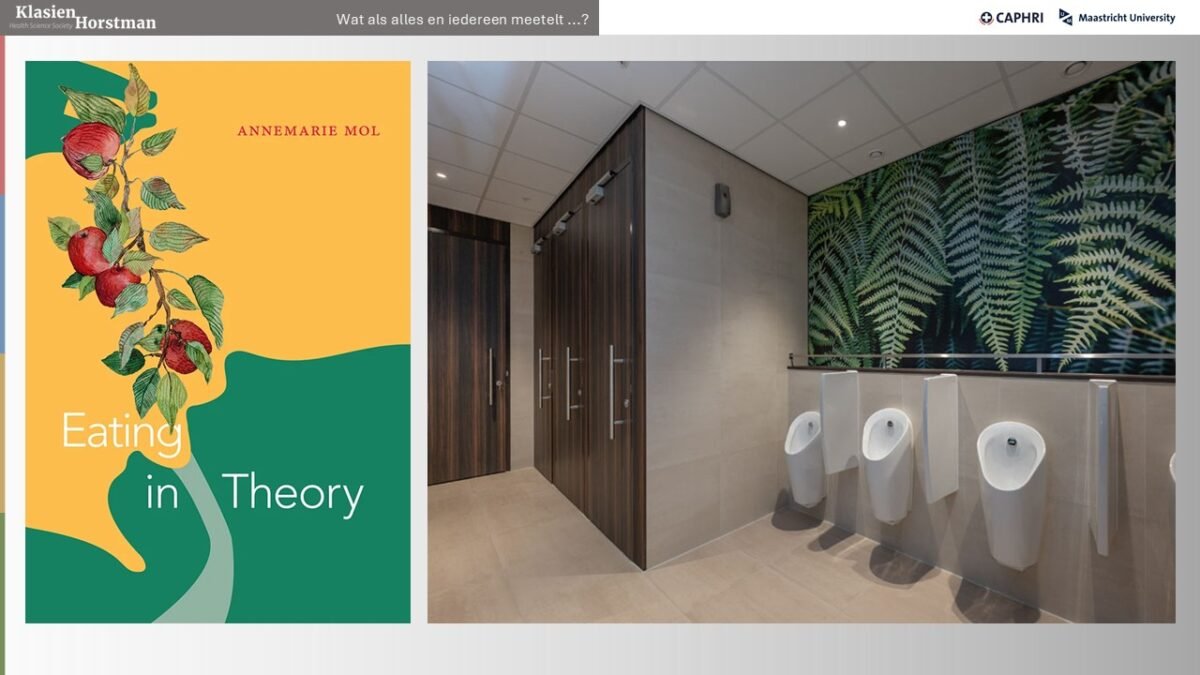 Mensen hebben een lichaam, en moet dus voedsel naar binnen, maar er komt ook van alles uit – ook in sjiek en sjoen Maastricht. In plaats van een denkend, rationeel mens die boven de natuur staat, schetst ze een beeld van mensen als onderdeel van een niet-beheersbare natuur. Dat betekent bijvoorbeeld ook een adequaat beleid voor publieke toiletten, niet alleen voor sommigen, mensen met prostaat- of darmproblemen, maar voor iedereen.